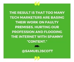Within the post, Scott proposes and defends the idea that marketing today is nothing more than repackaged hype, fueled by technology-company rhetoric, designed (really) to accomplish two things: (#1) sell more of their products and services and (#2) recruit young impressionable talent to join their "movement". The modern marketer - he believes - is drowning in a sea of buzzwords, and as a result, we have drifted too far away from what marketing really is (or was).